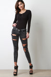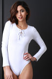 This jersey knit lace-up design on bust, long sleeves, and double snap button closure at crotch. Accessories sold separately. Made in U.S.A. 95% Cotton 5% Spandex.