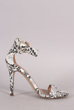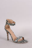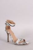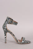 This open toe silhouette, featuring a rear back and an adjustable ankle strap. Embossed design throughout.
