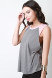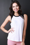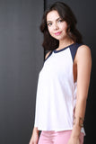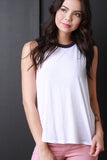 This casual top features a round neckline, color block shoulder design, and sleeveless. Finished with Jersey knit fabrication and a relaxed boxy fit. Accessories sold separately. Made in U.S.A. 50% Cotton , 50% Modal.