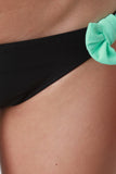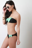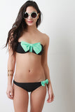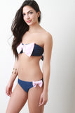 This adorable bikini set features a bandeau top with a large contrasting bow center, self-tie back, removable/adjustable halter strap, and removable padded cups. Bikini bottom features a low rise design, left side bow, and fully lined. Accessories sold separately. Made in U.S.A. 80% Nylon, 20% Spandex. Lining: 100% Polyester.