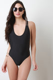This one piece swimsuit features a scoop neckline, 3-spaghetti shoulder straps, backless crisscross caged design, and cheeky back. Accessories sold separately. Made in U.S.A. 80% Nylon, 20% Spandex. Lining: 100% Polyester.