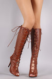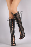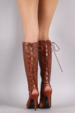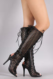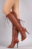 Perforated Peep Toe Lace Up Knee High Boots