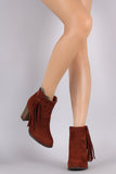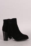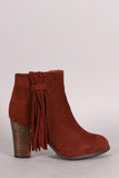 These ankle fringe tassel and an inner side zipper. Finished on a stacked chunky heel.