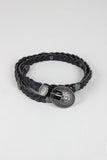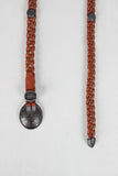 This ultra stylish belt features braided vegan leather, small embossed concho discs, and adjustable closure.