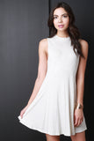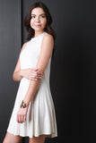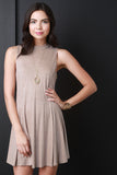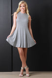 This mini shift dress features a ribbed knit fabrication, mock neckline, sleeveless construction, open back design and finished with a curved hemline. Accessories sold separately. Made in U.S.A. 96% Rayon, 4% Spandex.