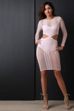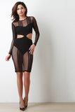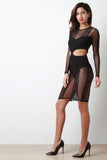 This semi-sheer midi dress features a striped patterned-mesh, high neckline with zipper closure at back, diamond shaped side cutouts, lined bottoms, lined bandeau and midi-length hemline. Accessories sold separately. Made in U.S.A. 9% Nylon, 5% Spandex.