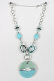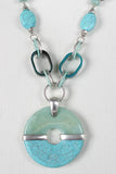 This bohemian style statement necklace features faux turquoise, brushed metal links and a round pendant made up of multiple materials. Necklace is finished with an adjustable lobster hook closure.