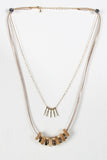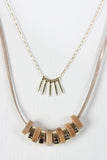This necklace features a vegan leather cord with metallic finish, wood and gold tone beads, and a second layer with a delicate faux gold chain. Finished with an adjustable lobster hook closure.