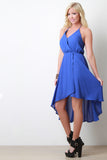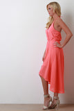 This gorgeous dress features a v-neckline with a snap for adjustable plunge, sleeveless construction with spaghetti halter straps, metal aglet detail and finished with midi-length high low tulip skirt, light weight chiffon fabrication, and elastic waist and back. Accessories sold separately. Self: 100% Polyester, Lining: 100% Polyester