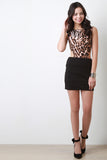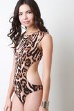 This sleek bodysuit features a leopard print throught, smooth stretchy knit fabrication, round neckline, sleeveless construction, and a side-to-back cutout that enhances curves. Finished with a double snap button closure at crotch. Accessories sold separately. Made in U.S.A. 96% Polyester, 4% Spandex.