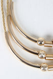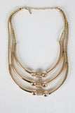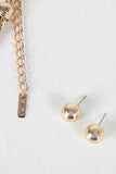 This edgy statement necklace features a braided vegan leather cord, high polished metallic beads and tubes, with an adjustable lobster hook closure and matching earrings with post backs.