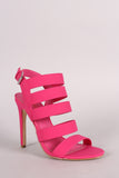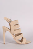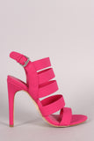 This irresistible  heel  features a strappy construction vamp, open toe silhouette, and wrapped stiletto heel. Finished with lightly padded insole and adjustable slingback strap with buckle fastening.