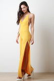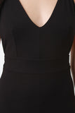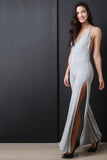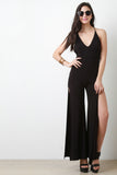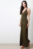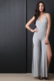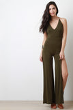 This jumpsuit features wide cut legs with slit constructed front, high waist seam, v neckline to spaghetti straps, and open back with cross straps. Accessories sold separately. Made in U.S.A. 95% Rayon, 5% Spandex.