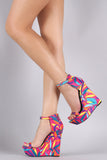 Tropical Leaves Print Open Toe Platform Wedge