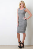 This sleeveless dress features a round neckline, ribbed marled knit fabrication, sculpture fit, and midi length. Accessories sold separately. Made in U.S.A. 55% Polyester, 40% Rayon, 5% Spandex.