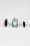 This set of three rings features one ring with faux stone center, one ring with engraving detail and black filled center and one ring with a gemstone center and rhinestone detail band. Bands are not adjustable.