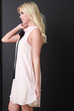 This dress features a flowy knit fabrication, v-neckline, ruffled collar with ribbon tie, and sleeveless construction. Finished with a lined underlay. Accessories sold separately. Made in U.S.A. Self: 65% Rayon, 35% Polyester. Lining: 100% Polyester.