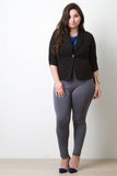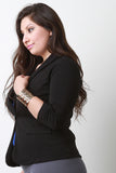 This plus size blazer features a stretchy textured fabrication, long sleeve design with ruched detail, form-flattering seams, and a single button closure. Finished with faux side pockets. Accessories sold separately. 96% Polyester, 4% Spandex.
