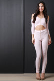 This jumpsuit features cold shoulder cut outs, a v neckline, midriff cut out, exposed metal zipper details, long sleeves, tapered legging bottom. Accessories sold separately. Made in U.S.A. 95% Polyester 5% Spandex.