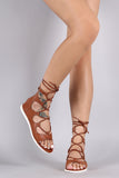 This gladiator inspired vegan leather sandal features an adjustable lace-up closure, open toe silhouette, back zipper for easy on/off, and lug sole low platform. Finished with a lightly padded insole for comfort.