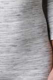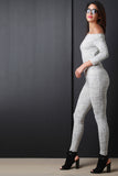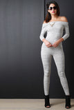 This jumpsuit features an off the shoulder fold over neckline, marbled knit fabrication, three quarter sleeves, and tapered leggings. Accessories sold separately. Made in U.S.A. 95% Rayon, 5% Spandex.