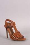 This huarache woven front vamp with a t-strap and adjustable ankle strap. Features light padding ball of foot area. Finished on a stiletto heel.