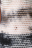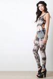 This jumpsuit features a knit mesh fabrication, tie dye print, contrast binding, spaghetti straps, scoop neckline, tapered legs, and a lower back cut out. Accessories sold separately. 95% Polyester, 5% Spendex.