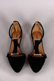 This stylish pointy toe silhouette, T-strap with gold-plated hardware detailing, and open shank construction. Finished with a lightly padded insole and convenient back-zip closure.