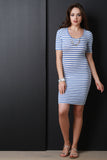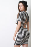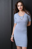 This stylish  bodycon dress  features horizontal stripes, scoop neckline, short sleeves, and criss-cross lace back. Accessories sold separately. Made in U.S.A. 95% Rayon, 5% Spandex.
