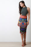 This pencil skirt features a high waist design, bold abstract geometric print, stretchy sculpturing fit, and midi length hemline. Accessories sold separately. Made in U.S.A. 92% Polyester, 8% Spandex.