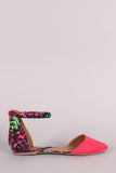 This chic ballet flat features an abstract floral print, pointy toe silhouette, open shanks, ankle cuff, and rear zip-up closure. Finished with a lightly padded insole.
