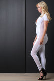 This chic jumpsuit features a jersey knit fabrication with contrasting mesh panel on sides, flat collar design, short sleeves, and front zip-up closure. Finished with tapered legs. Accessories sold separately. Made in U.S.A. 95% Cotton, 5% Spandex.