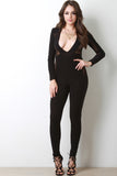 This sleek jumpsuit features a deep V-neckline, long sleeves, sculpturing fit, taper leggings, and semi-sheer mesh panels. Accessories sold separately. Made in U.S.A. 96% Polyester, 4% Spandex.