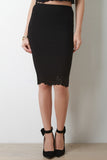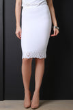 This skirt features a texture knit fabrication, elasticized waist with a zipper fastener at back, sculpture fit, and scallop hemline with eyelet accent. Accessories sold separately. Made in U.S.A. 96% Polyester, 4% Spandex.