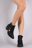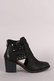 These western cowgirl booties feature an almond toe silhouette, side cutouts, instep perforated straps with buckle accent, and chunky stacked heel. Finished with cushioned insole and convenient back-zip closure.