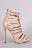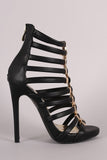 This stunning heel features a strappy construction with gold-tone hardware embellishment, open toe silhouette, low platform, and wrapped stiletto heel. Finished with lightly padded insole and rear zipper closure for easy on/off.