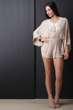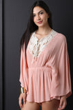 This stylish romper features a woven knit fabrication, crochet trimmed neckline detail, dolman sleeves, and self-tie drawstring at nape. Finished with an elasticized cinched waist, and ruffled hemline. Accessories sold separately. 100% Rayon.