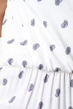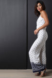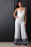 This casual jumpsuit features a surplice triangle top, elastic spaghetti straps, elastic waist and back, wide cut legs, finished with a contrast printed hemline. Accessories sole separately. Made in U.S.A. 100% Rayon.