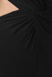 This jumpsuit features a jersey knit fabrication, plunging v-neckline with twisted knot detail at midsection, elbow sleeves, and side-to-back cutout design. Finished with a rear zip-up closure and taper cut legs. Accessories sold separately. Made in U.S.A.