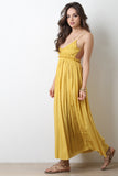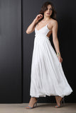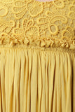 This flowy dress features a crochet lace top, sweetheart neckline, adjustable spaghetti straps, open back, and ruffled elasticized waist and skirt. Finished with under lining. Accessories sold separately. 50% Rayon, 50% Polyester.