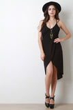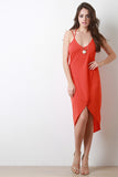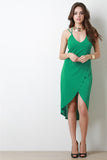 This sexy dress features a v neckline, knit fabrication, adjustable multi strap design, low cut back, high low hem, wrap front cut, and a full lining. Accessories sold separately. Self: 92% Polyester, 8% Spandex. Lining: 100% Polyester.