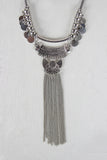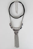 This necklace set features a vegan leather choker, and a gypsy inspired necklace with metal discs and a chain fringe tassels. both necklaces have adjustable lobster claw closures.
