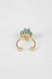 This unique ring features a faux turquoise stone nestled on a claw-like frame, finished with a polished metal open-ended band. Non-adjustable.