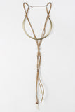 This necklace features vegan leather cord, decorative beads and string wrapping, faux tusk. rounded metal collar, matching earring, and adjustable lobster claw closure.