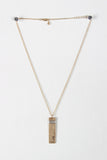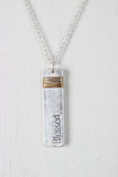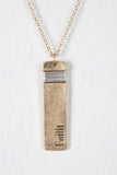 This necklace features a rectangular pendant with a wire wrapped detail and a stamped word, on a thin belcher chain, finished with and adjustable lobster claw closure and matching earrings.
