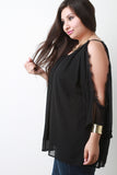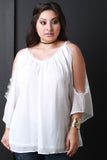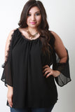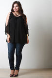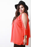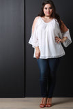 Frayed Lace Trim Cold Shoulder Bell Sleeve Top