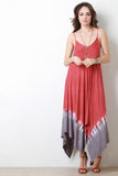 This jersey knit maxi dress features a tie dye handkerchief hemline, v-neckline, and spaghetti shoulder straps. Accessories sold separately. 96% Rayon, 4% Spandex.