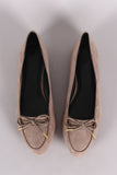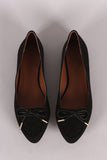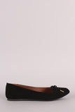 This adorable loafer flat features an almond toe silhouette, bow design at front with gold tone aglets, lightly padded insole, and easy slip on style.