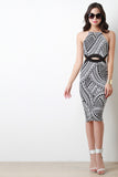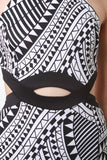 This sexy bodycon dress features a knit fabrication, square neckline, elastic spaghetti straps, contrast waistband, midriff cit out midi length hemline, and an invisible zipper closure. Accessories sold separately. Made in U.S.A. 95% Polyester, 5% Spandex.