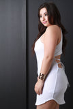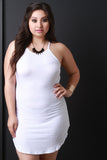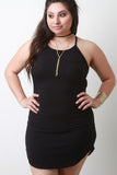 This sexy plus size dress features a rib knit fabrication, bodycon fit, spaghetti straps, back keyhole with button closure at nape, lower back cut out with lace up detail. and a mini length rounded hemline. Accessories sold separately. Made in U.S.A. 48% Polyester, 48% Cotton, 4% Spandex.